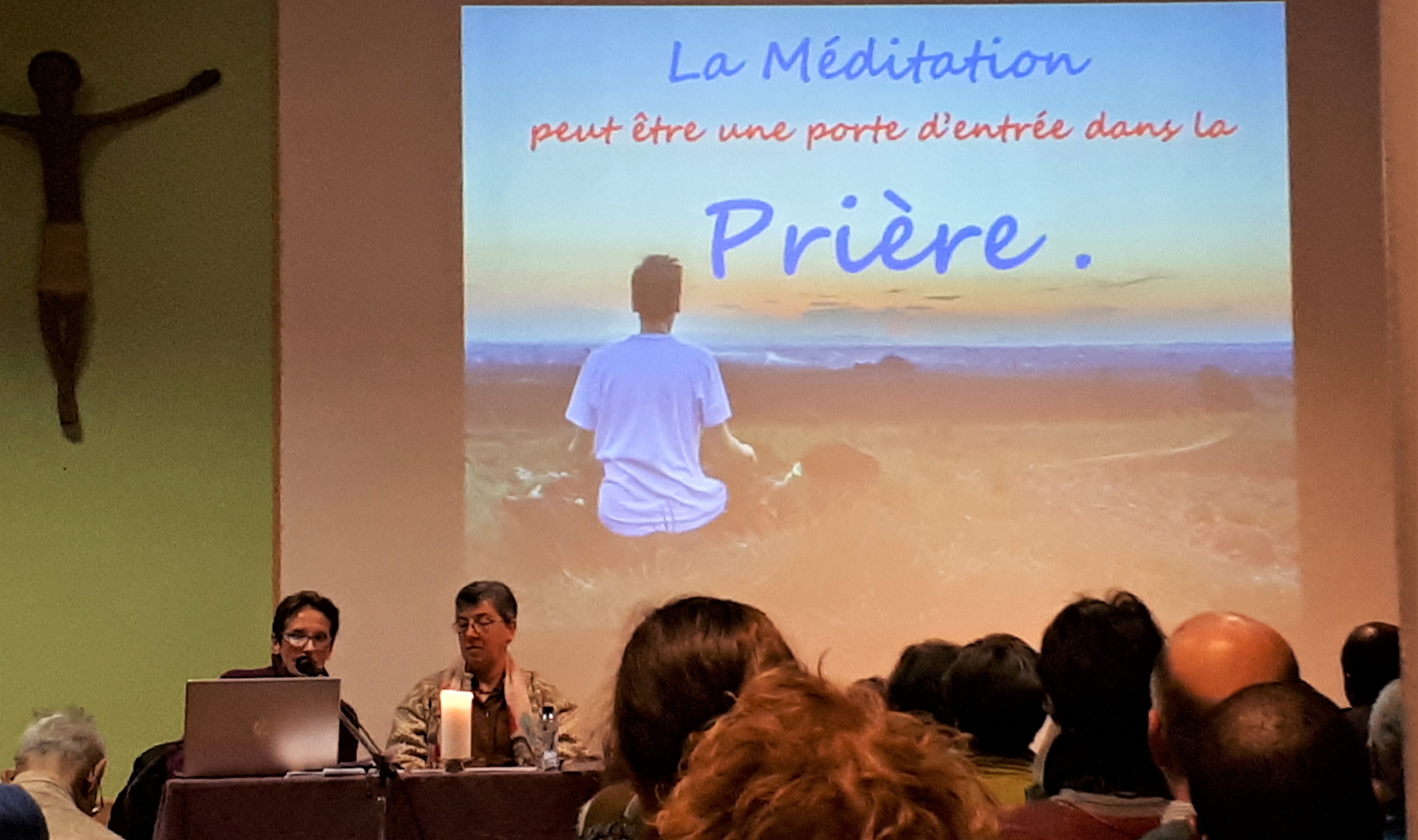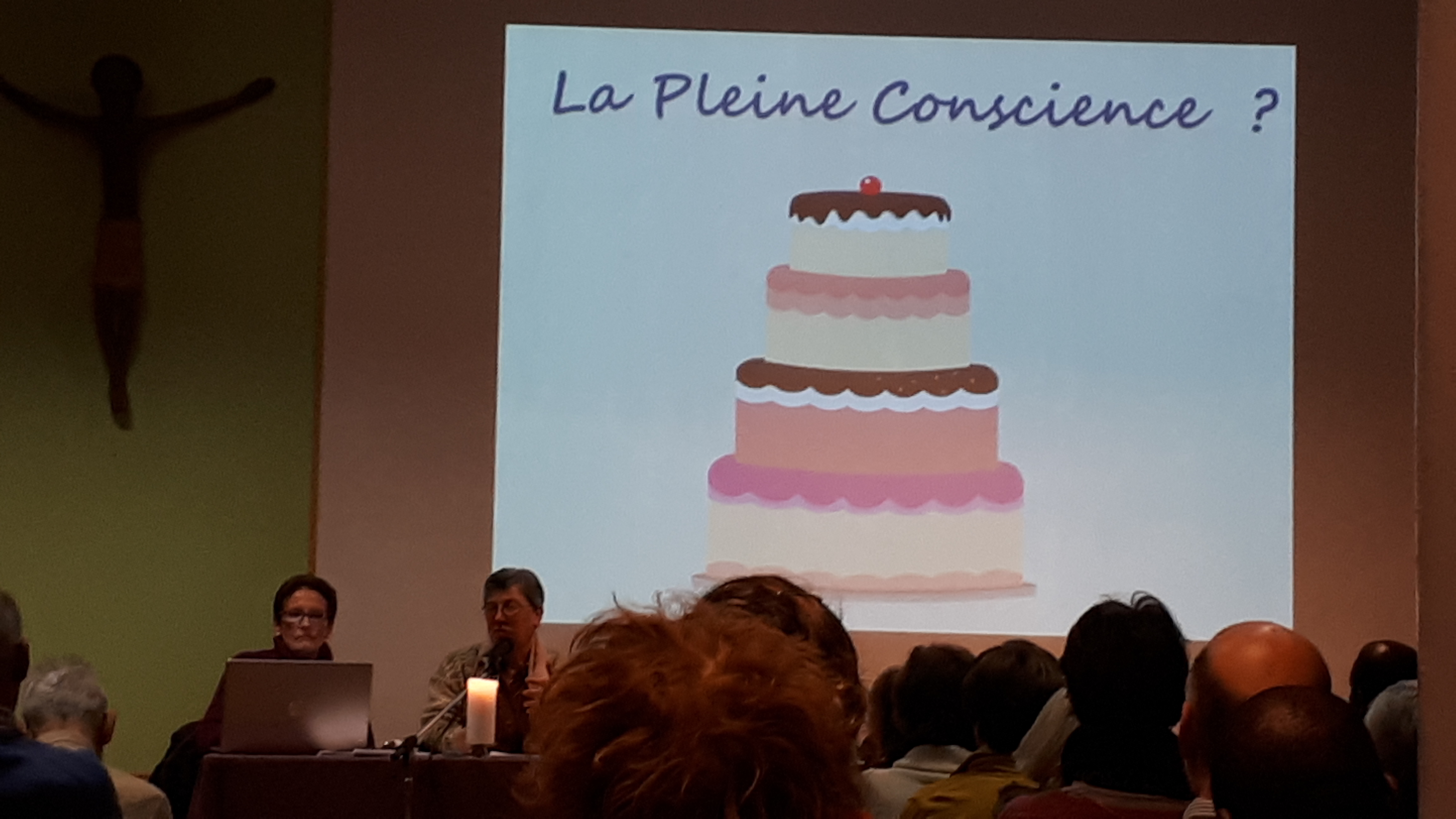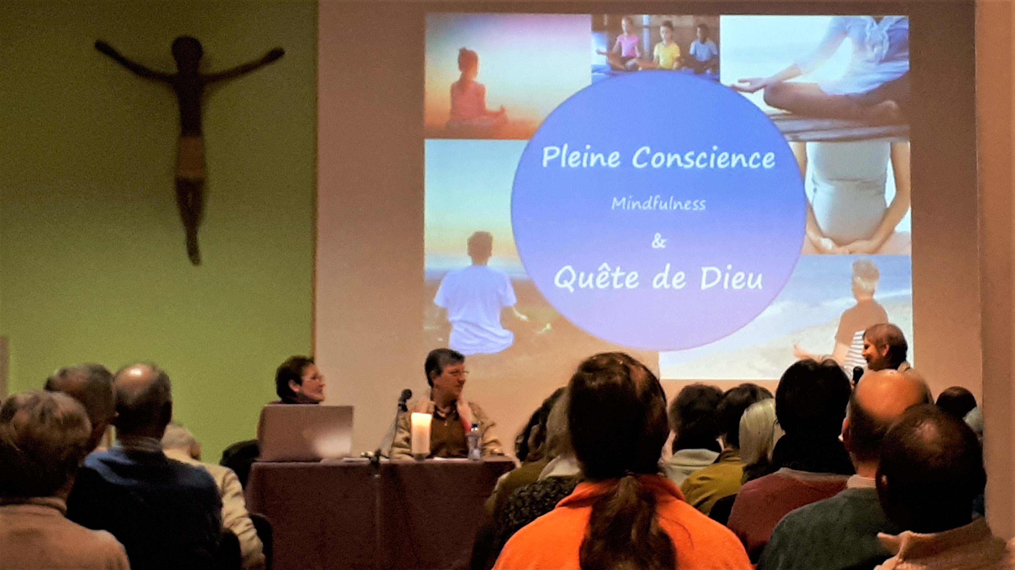Chantal Lapchin a commencé par nous présenter l’origine de la méditation, de la Pleine Conscience et à quel point celle-ci peut être une porte d’entrée dans la prière, puis Françoise Rassart nous a fait EXPERIMENTER la Pleine Conscience avec des moments clairement orientés vers la Présence de Jésus. Ceci étant le principal de la soirée, il est difficile d’en faire un compte-rendu.