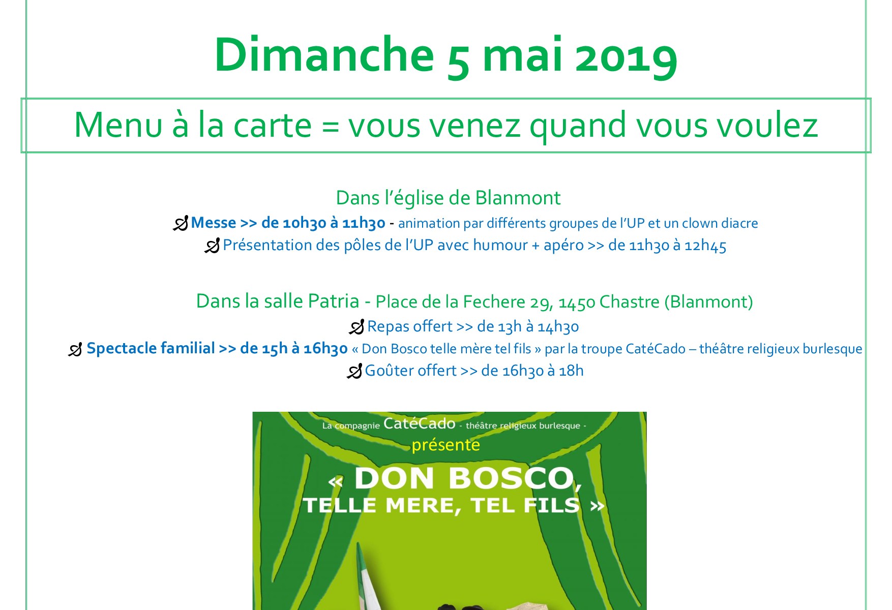 De 13h à 18h >> dans la salle Patria de Blanmont (place de la Fechere 29) : repas puis spectacle familial « Don Bosco telle mère tel fils » par la troupe CatéCado – théâtre religieux burlesque – ensuite goûter