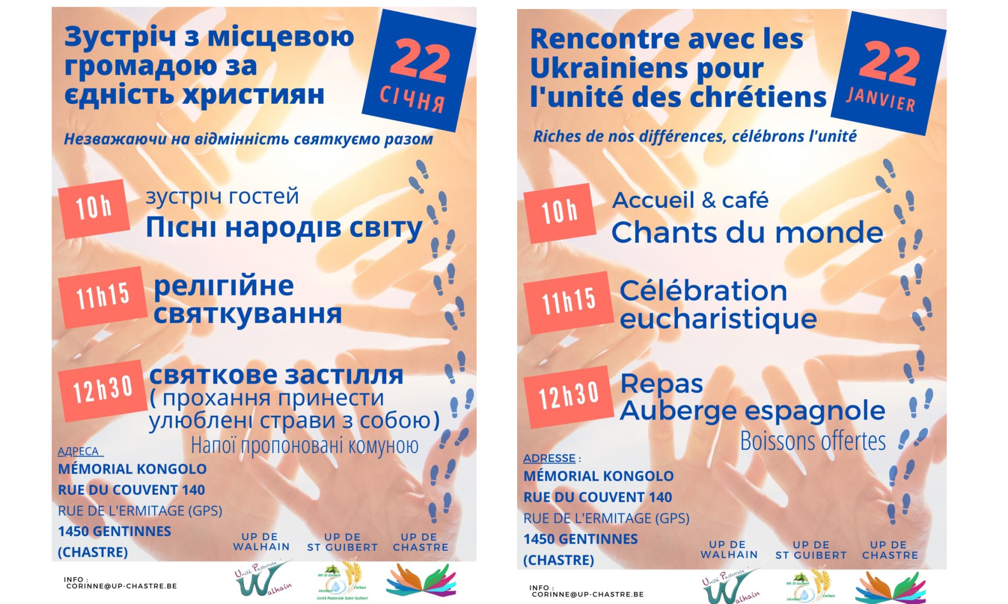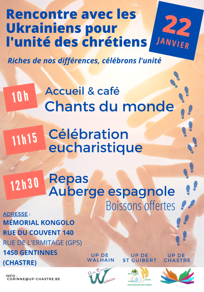 Dans le cadre de la semaine de prière pour l’unité des chrétiens, notre doyenné de Walhain – qui comprend 3 UP : les Unités Pastorales de Saint-Guibert, de Walhain et de Chastre – organise une rencontre et célébration avec les Ukrainiens et leur prêtre père Adam Figurek.