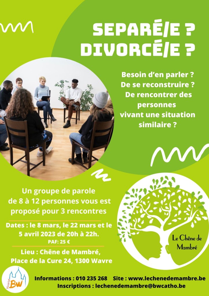 Vivre une séparation ou un divorce est une période difficile à traverser… Un accompagnement bienveillant peut permettre aux personnes qui affrontent une telle situation de se sentir moins seules. A cette fin, Le Chêne de Mambré propose aux personnes séparées ou divorcées, un groupe de parole pour leur permettre de retrouver un ancrage et d’aller de l’avant !