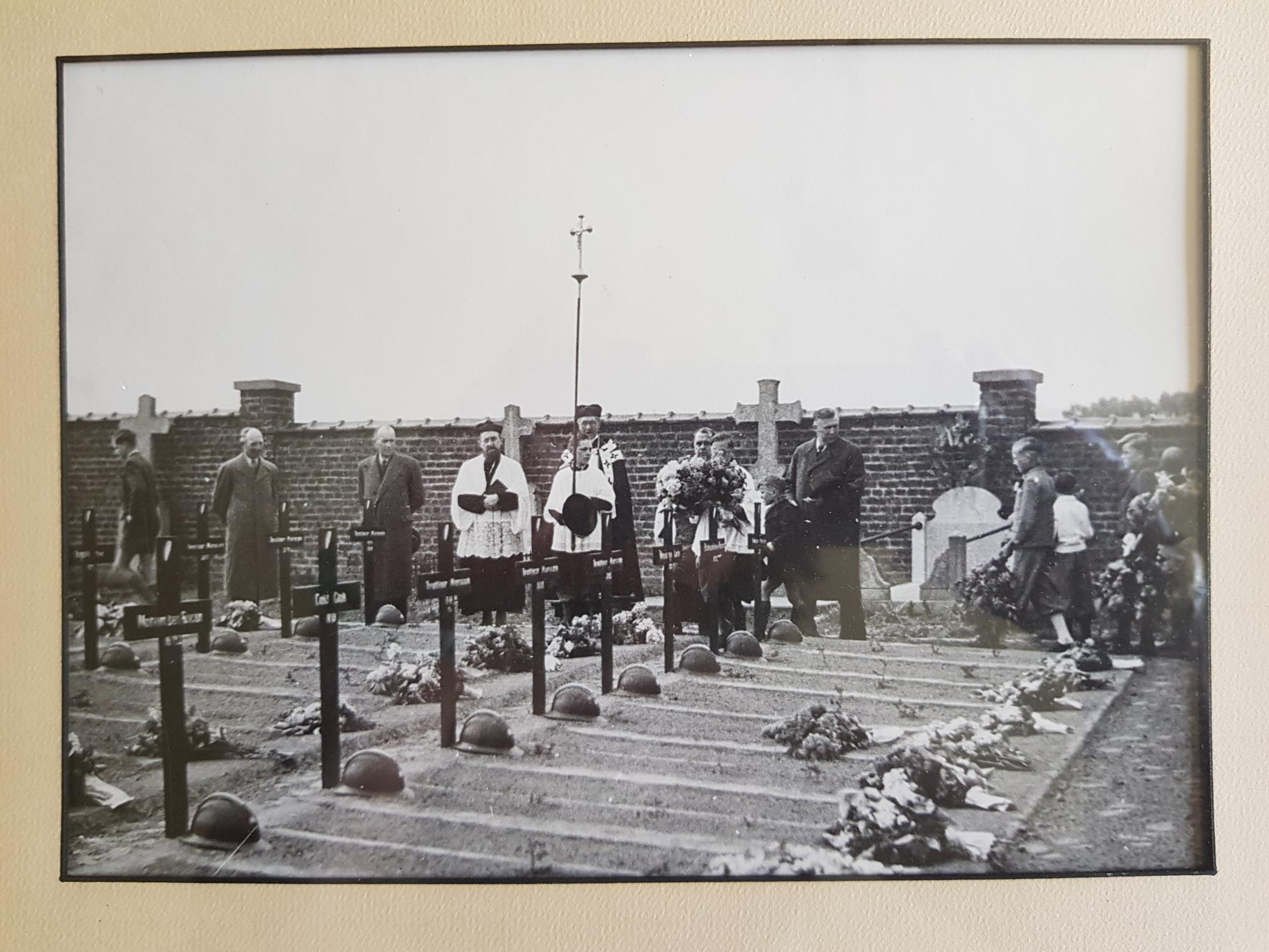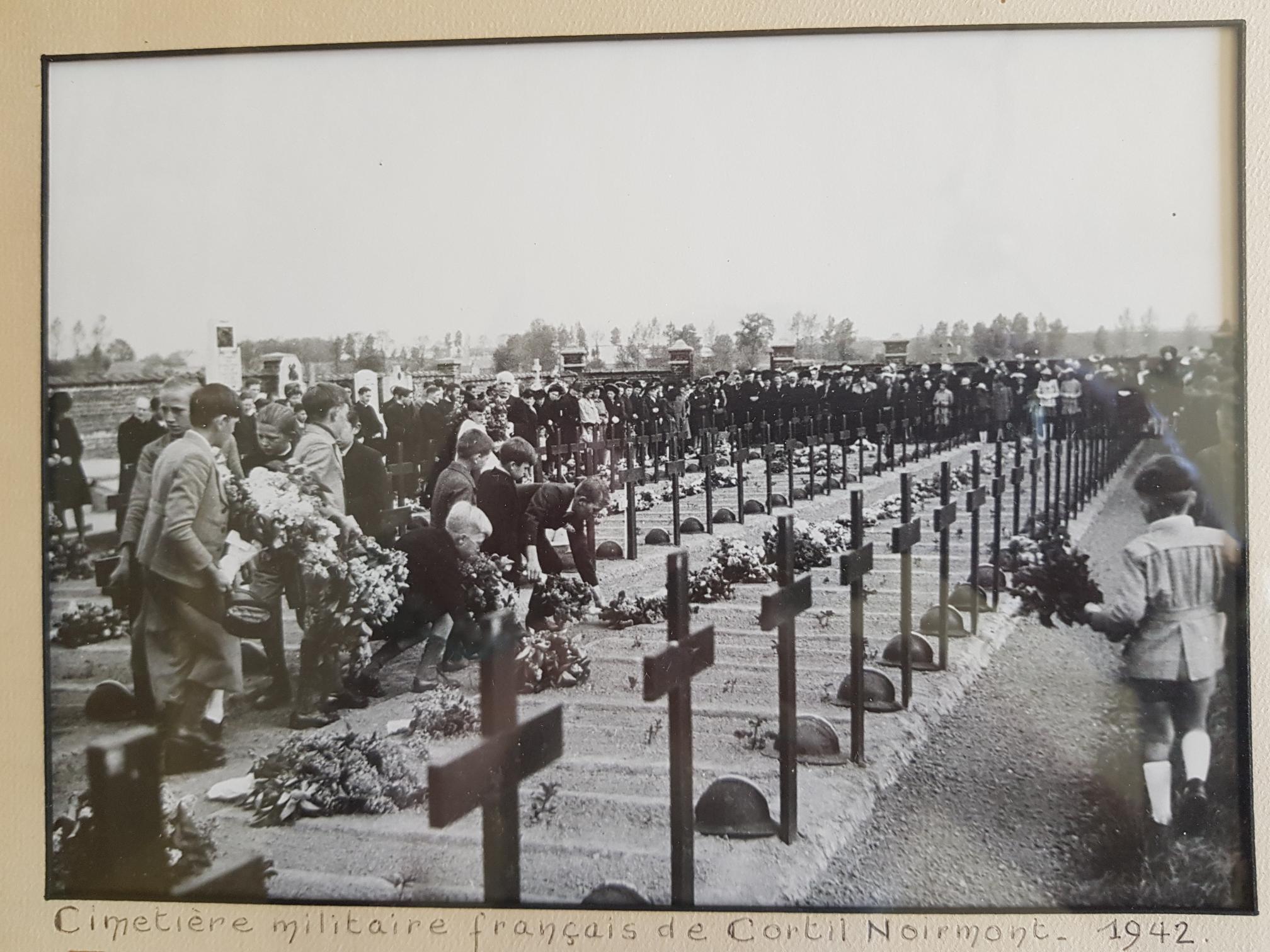 Les photos au cimetière de Cortil datent de la première messe des français en 1942. Il faut savoir qu’à l’extérieur du cimetière à l’entrée se trouvaient 2 automitrailleuses allemandes qui avaient pour mission d’empêcher la population d’entrer dans le cimetière ! La population a placé les enfants devant et les a bravés. Cet événement a été orchestré par le curé de l’époque, par l’institutrice et par madame Hubinon française d’origine et grand mère de Christine Latour de Cortil.