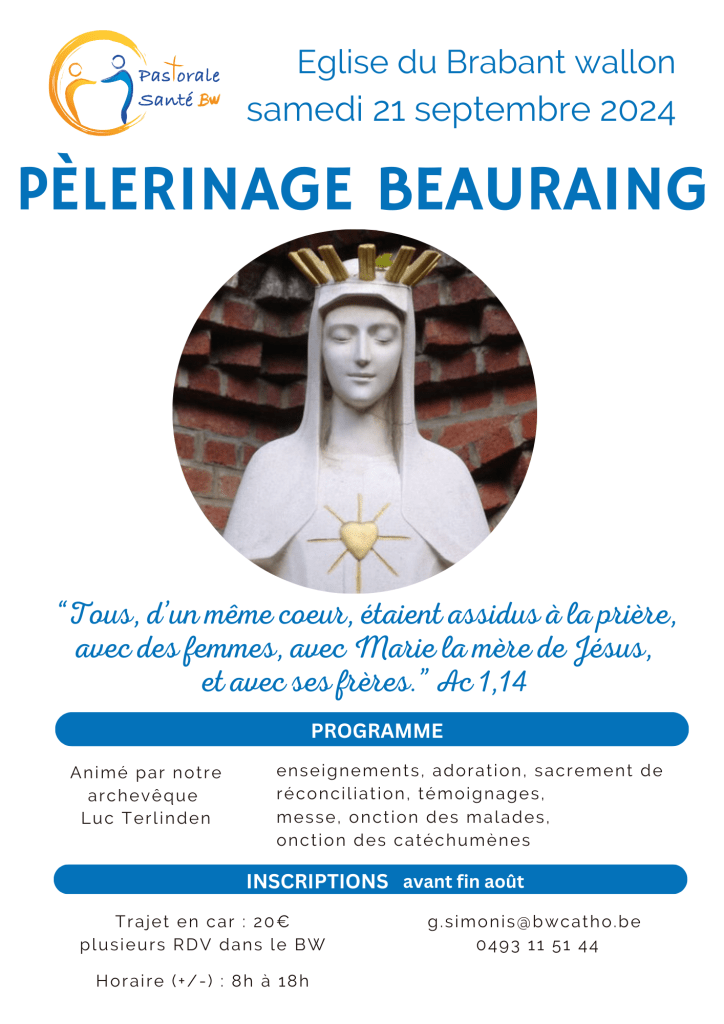 - Les inscriptions (cars et repas) sont centralisées au Vicariat : 0493 11 51 44 ou par mail : g.simonis@bwcatho.be Merci de mentionner votre nom, prénom et votre lieu de départ : (Nivelles, Braine l’Alleud, Waterloo, Rixensart, Wavre, Louvain-La-Neuve, Jodoigne, Corbais, Perwez, Walhain, Ramilies).