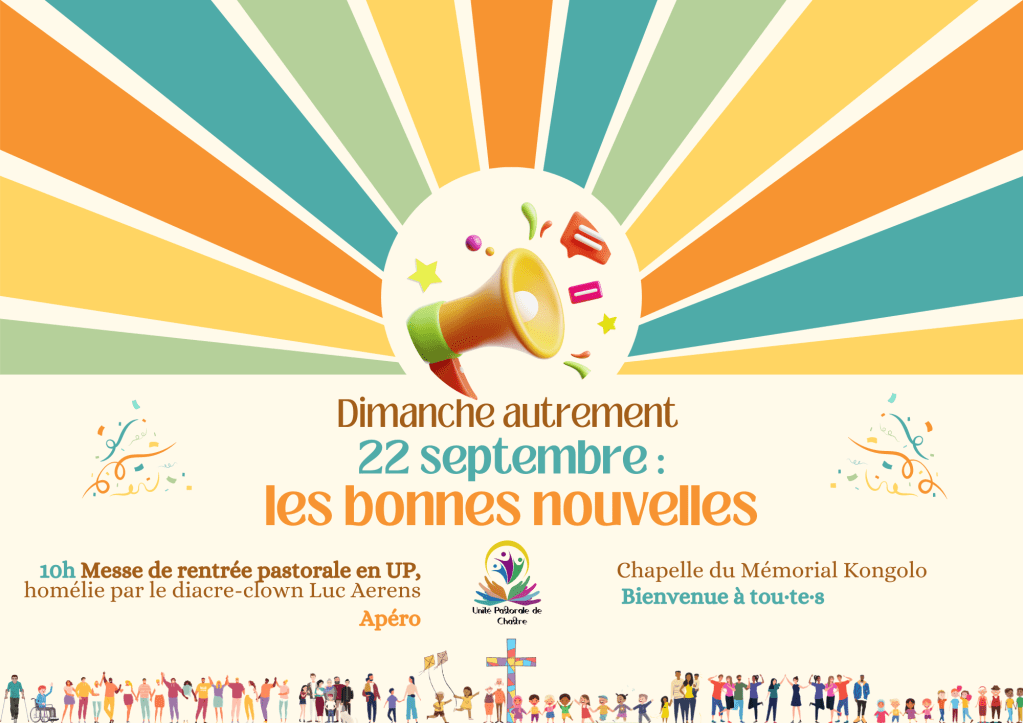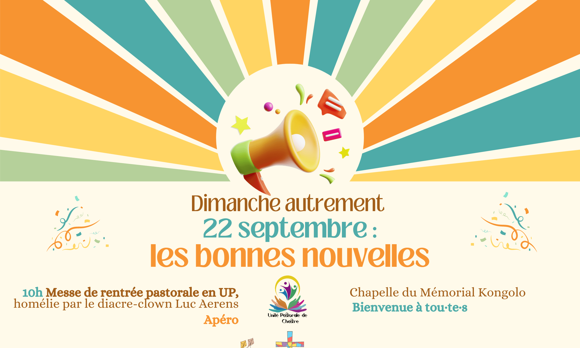 Nous gardons l’idée des BONNES NOUVELLES, avec une messe en présence de Luc Aerens, diacre clown qui assurera l’homélie en clown, puis un apéro, le tout en UP bien sûr ! Occasion aussi de vivre la rentrée scolaire et pastorale tou·te·s ensemble.