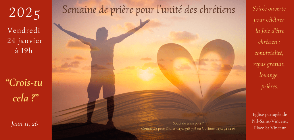 Le doyenné de Walhain (qui comprend les 3 Unités Pastorales de Walhain, Mont-Saint-Guibert et Chastre) organise une soirée de célébration en collaboration et unité avec nos frères et sœurs protestants de la région pour se rencontrer et prier ensemble, le VENDREDI 24 janvier 2025.