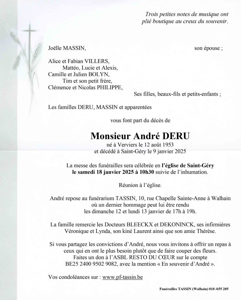 Dans la peine et l’espérance, nous vous annonçons le décès de notre ami André Deru, paroissien de Gentinnes / St Géry, administrateur de l’AOP de St Géry, et grand spécialiste de l’épinette à bourdon.