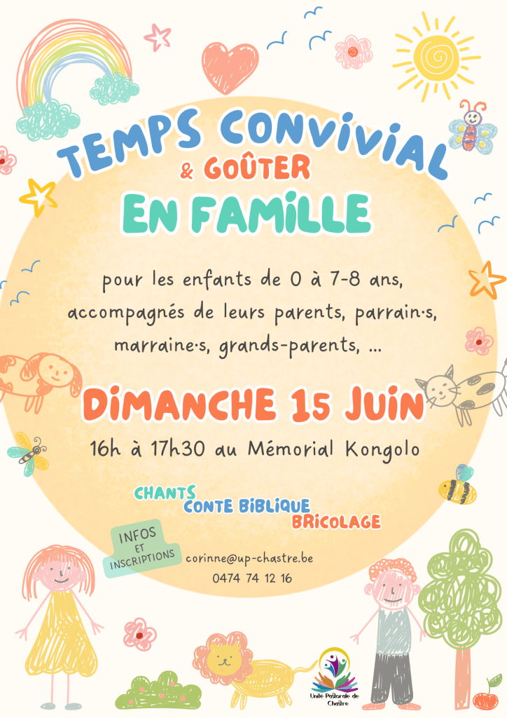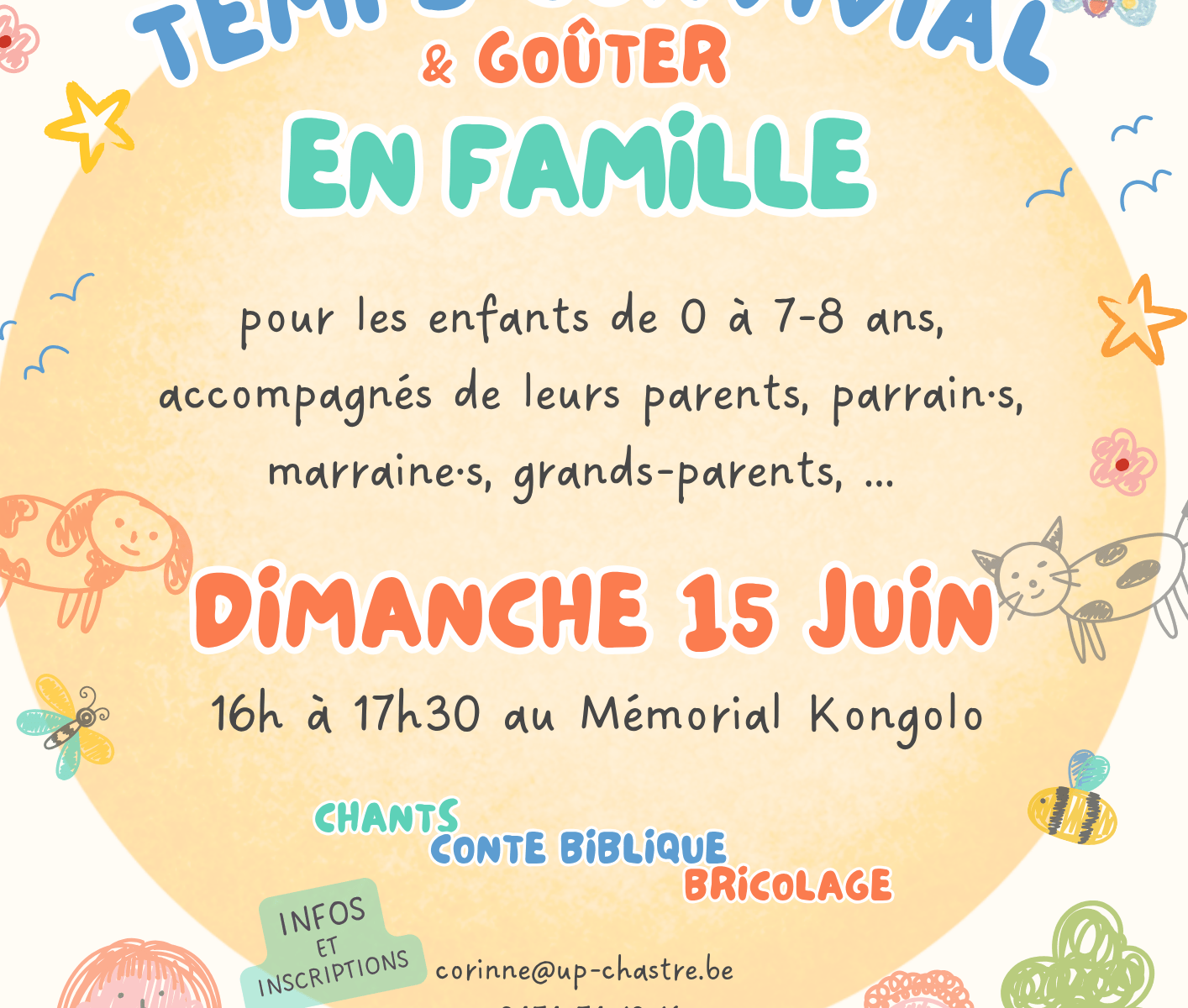 le DIMANCHE 15 juin de 16h à 17h30 au Mémorial Kongolo pour un temps de qualité avec vos enfants de 0 à ~= 7-8 ans, même s’ils n’ont pas été baptisés (ce n’est pas un passeport d’entrée ;-)).