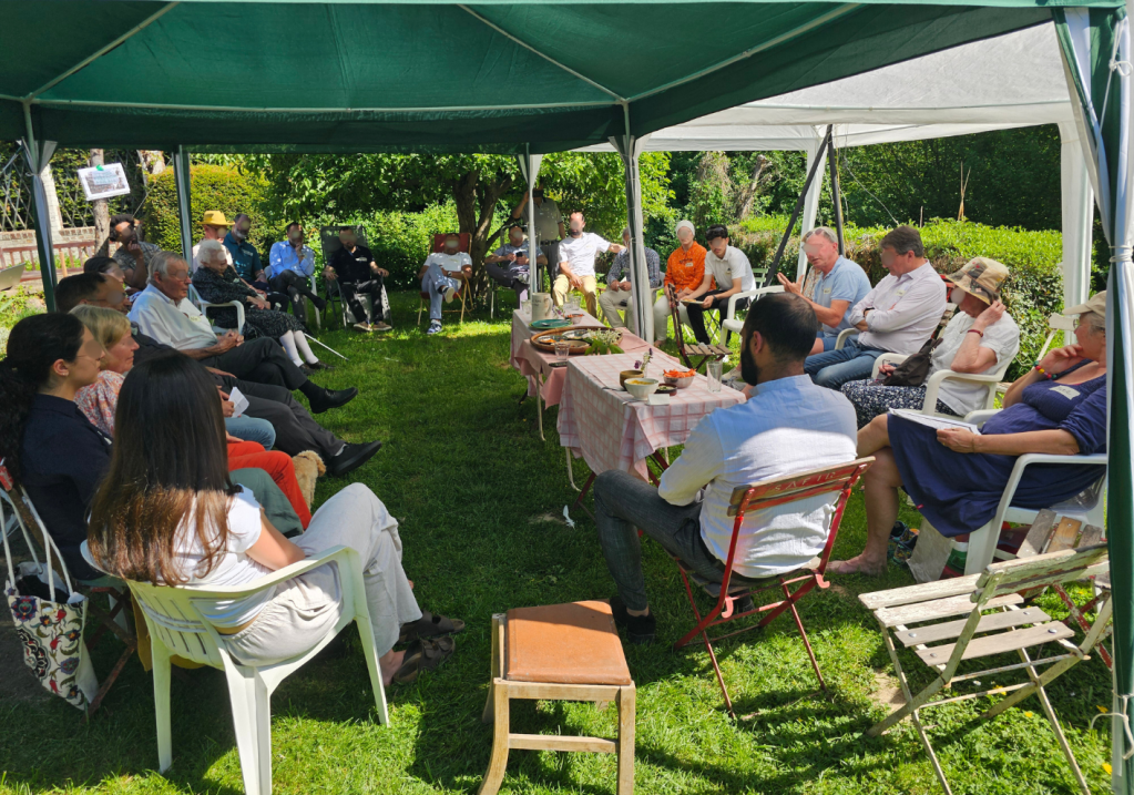 Quelle joie de voir arriver le fidèle Zoher, aussi resplendissant et joyeux que le soleil de ce 1er mai ! Il est le premier convive. Les arrivées s’égrainent durant toute l’après-midi. Le buffet s’enrichit peu à peu d’excellents plats ou desserts aux saveurs orientales accompagné du thé à la menthe préparé par des mains expertes. La beauté et la diversité du jardin fleuri est à l’image de ce beau rassemblement qu’il accueille. Chrétiens et musulmans de diverses origines, jeunes et vieux, du voisinage ou de plus loin – Bruxelles ou Namur. Une délégation avec l’imam et le président de la mosquée de Court-St-Etienne… En tout, une bonne cinquantaine de personnes.
