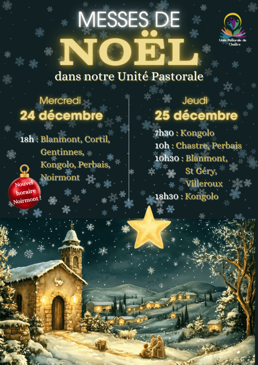 Pour connaître les détails par paroisse, aller dans ACTUALITES de la paroisse concernée ou cliquez ci après sur le nom de la paroisse qui a diffusé des détails au sujet des célébrations de la Nativité de notre Seigneur : Blanmont, Gentinnes/St Géry, Perbais, Villeroux/Cortil.