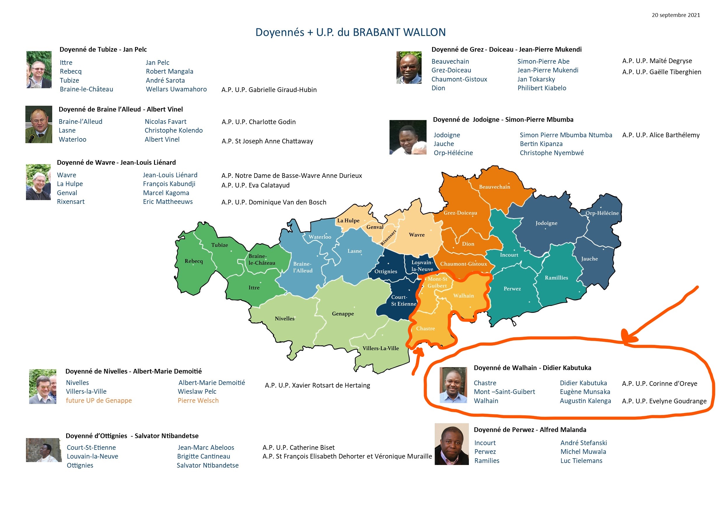Notre UP fait partie du « doyenné de Walhain », qui comprend 3 Unités Pastorales : l‘UP de Mont-Saint-Guibert, l’UP de Walhain et l’UP de Chastre. Le doyenné de Walhain fait lui-même partie du vicariat du Brabant-Wallon.