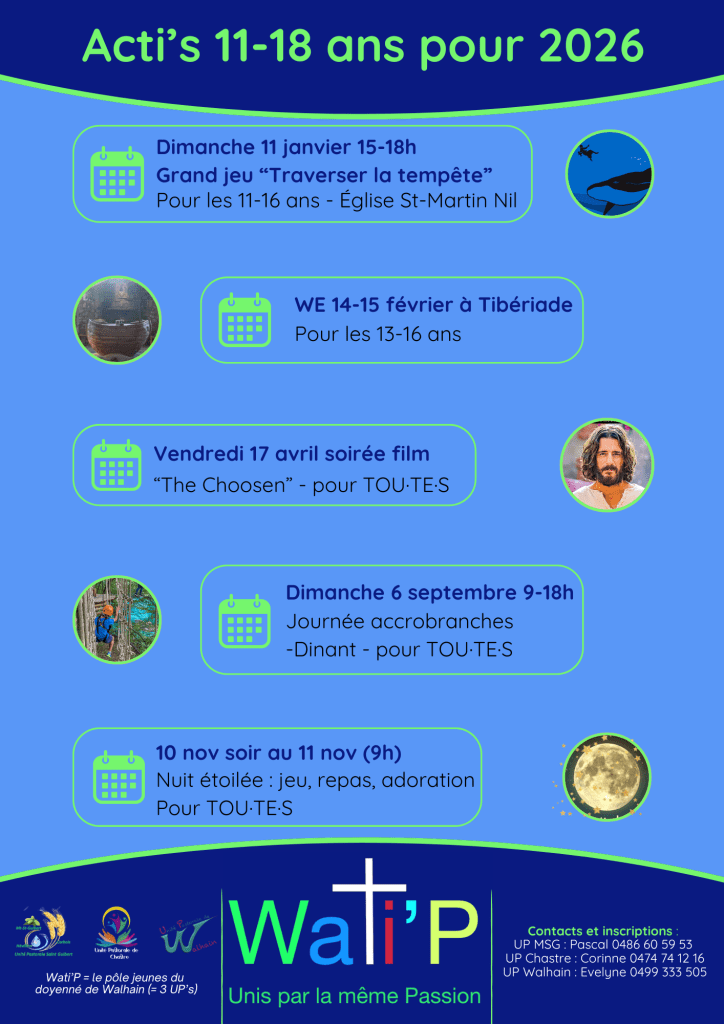 Assistante pastorale UP de Walhain : Evelyne BOSQUEE +32 499 33 35 05 – evelyne.upwalhain@gmail.com